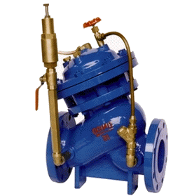 當(dāng)管道從進水端給水時,水流過針閥進入主閥控制室,出口壓力通過導(dǎo)管作用到導(dǎo)閥上,當(dāng)出口壓力高于導(dǎo)閥設(shè)定值時,導(dǎo)閥關(guān)閉,控制室停止排水,此時主閥控制室內(nèi)壓力升高并關(guān)閉主閥,出口壓力不再升高。